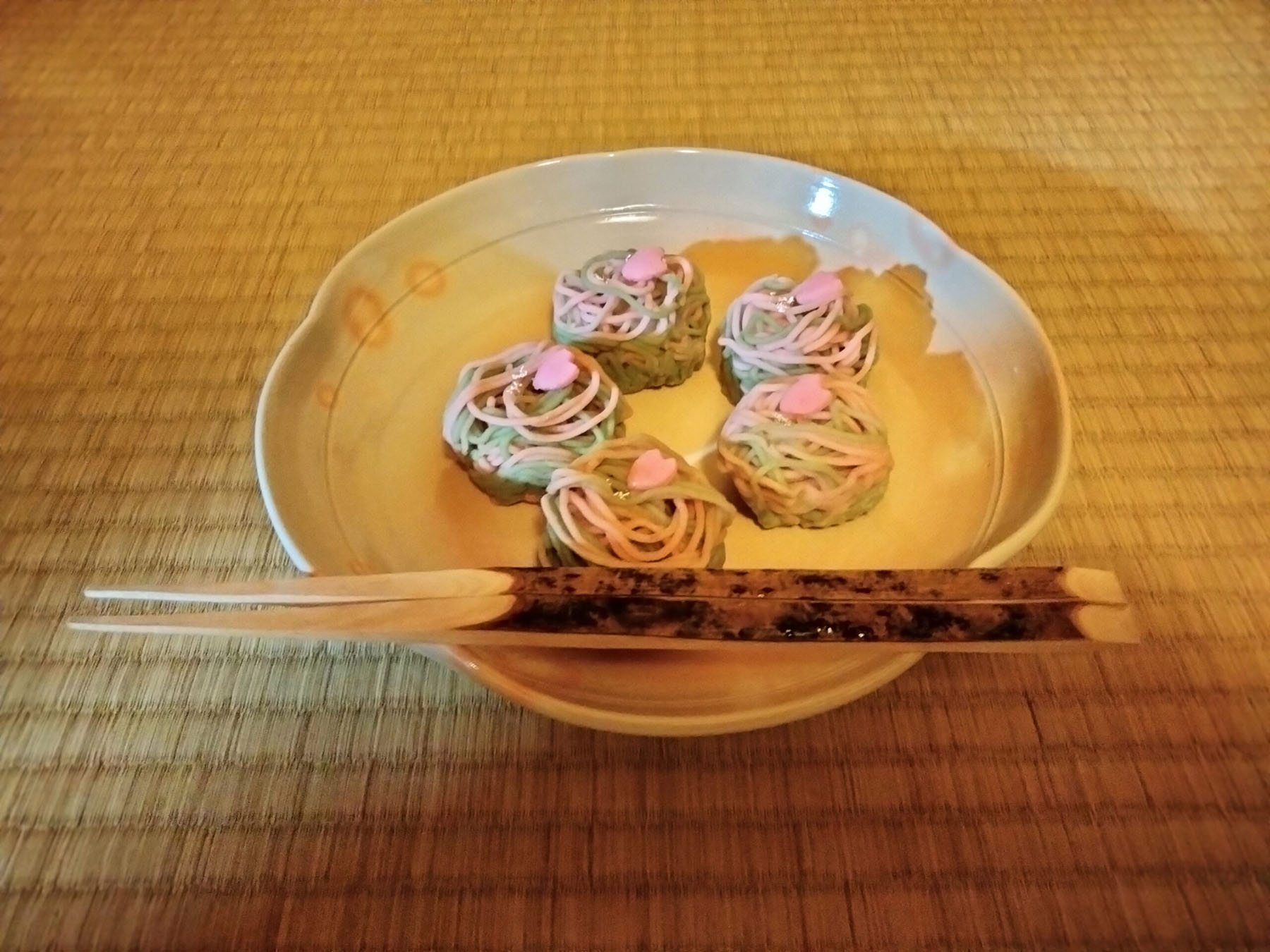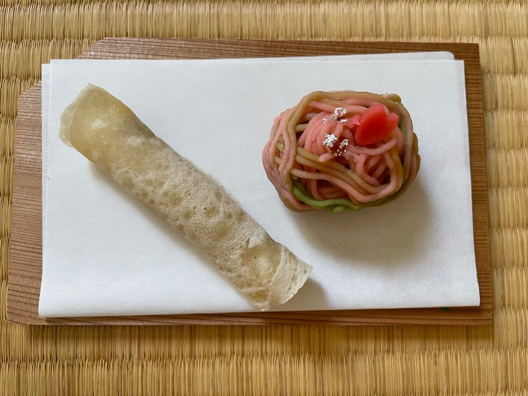春の訪れを感じる手作りのお菓子「うららか」と「利休麩の焼き」が供され、利休居士にちなんだしつらいの恩愛の趣にふれつつ、一碗のお茶をいただきました。