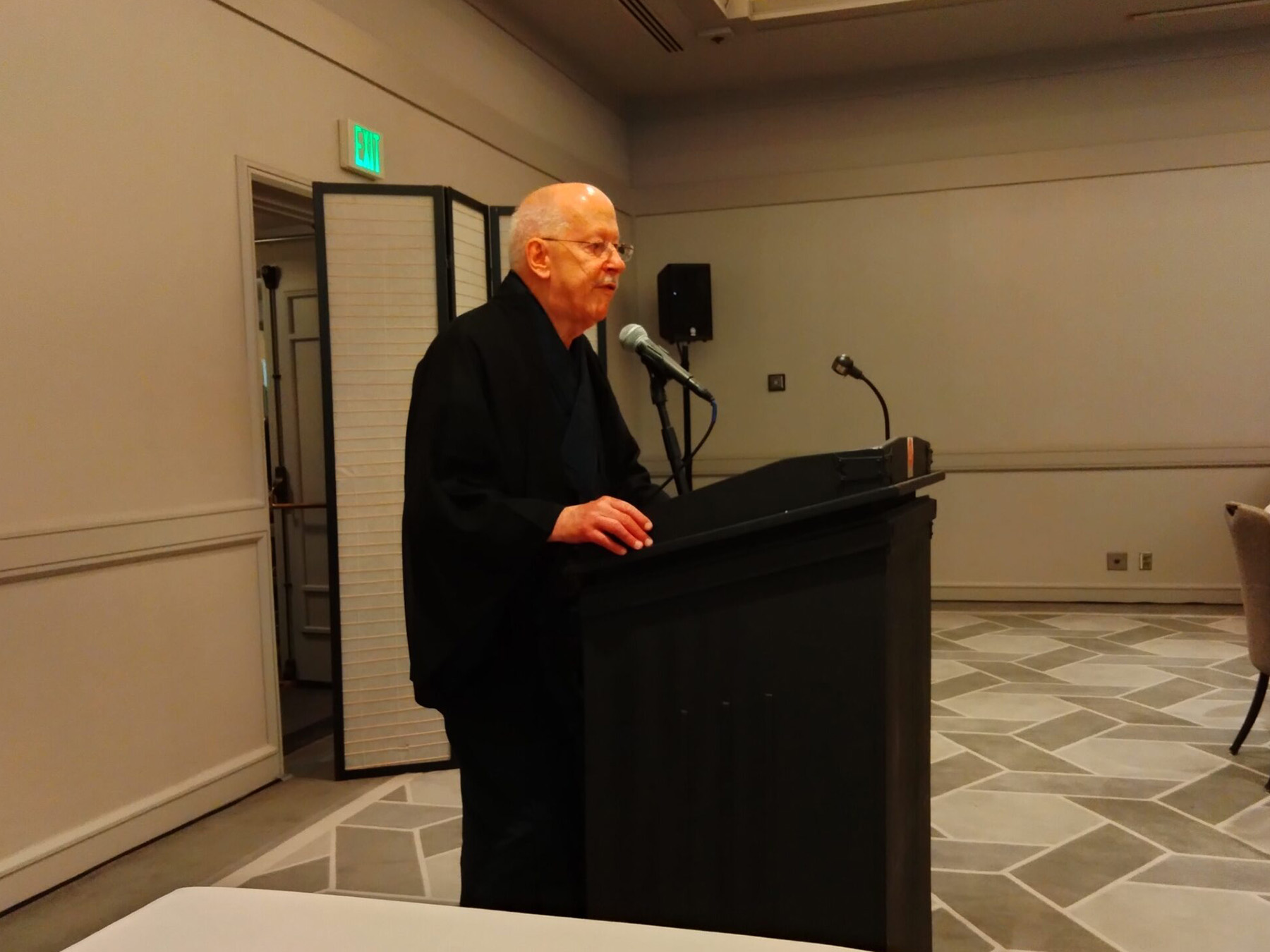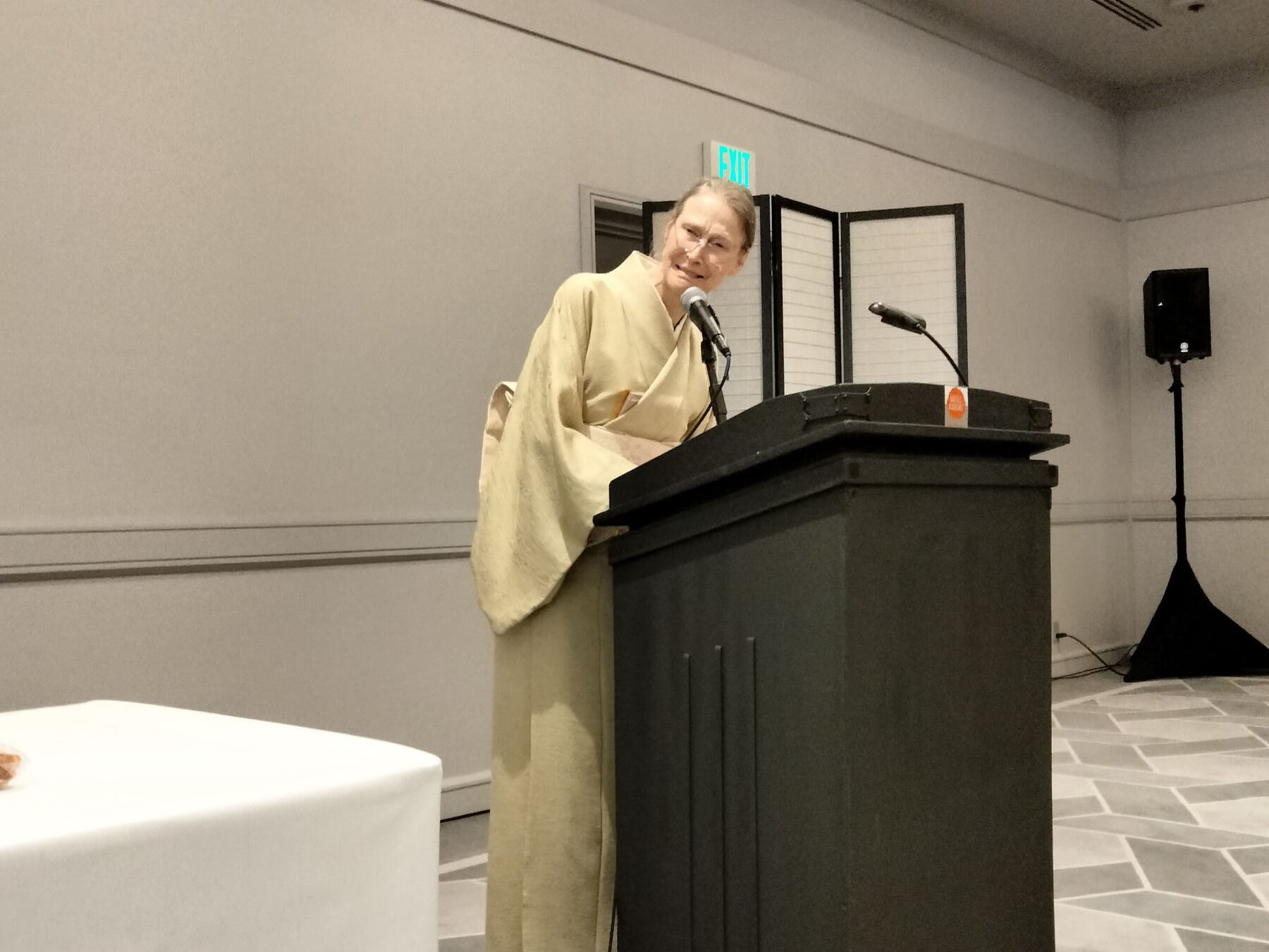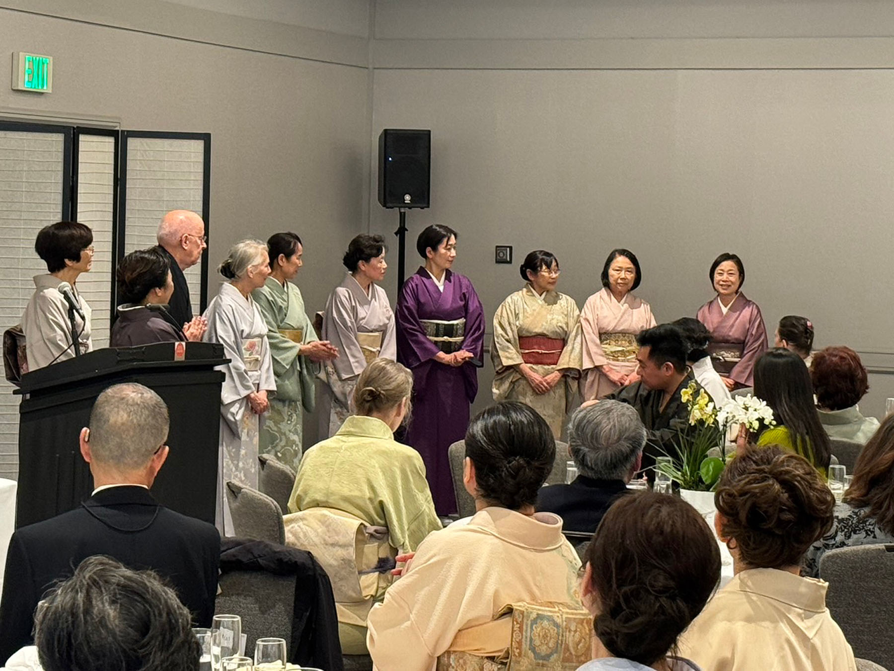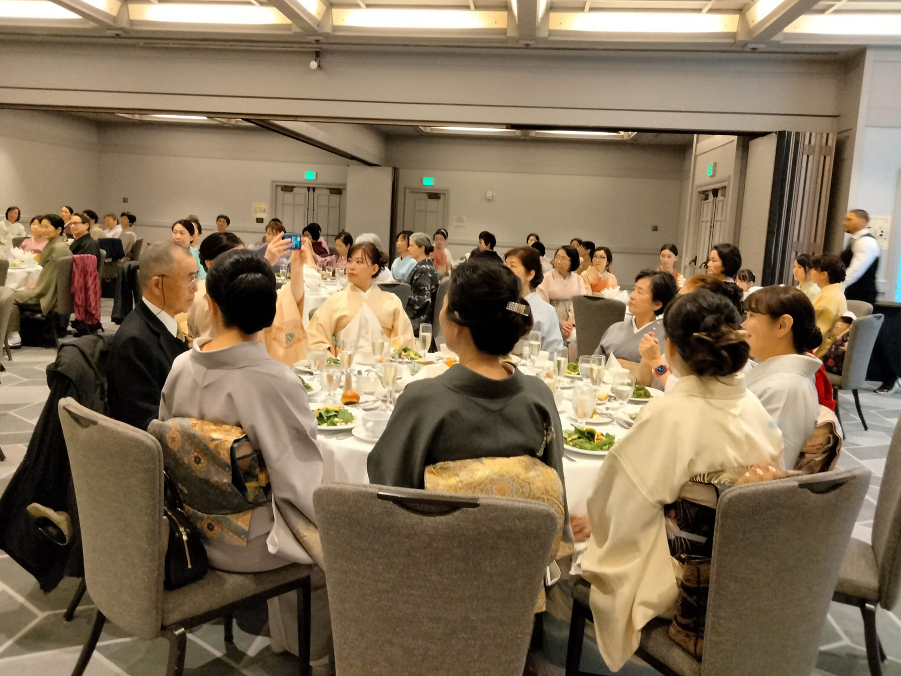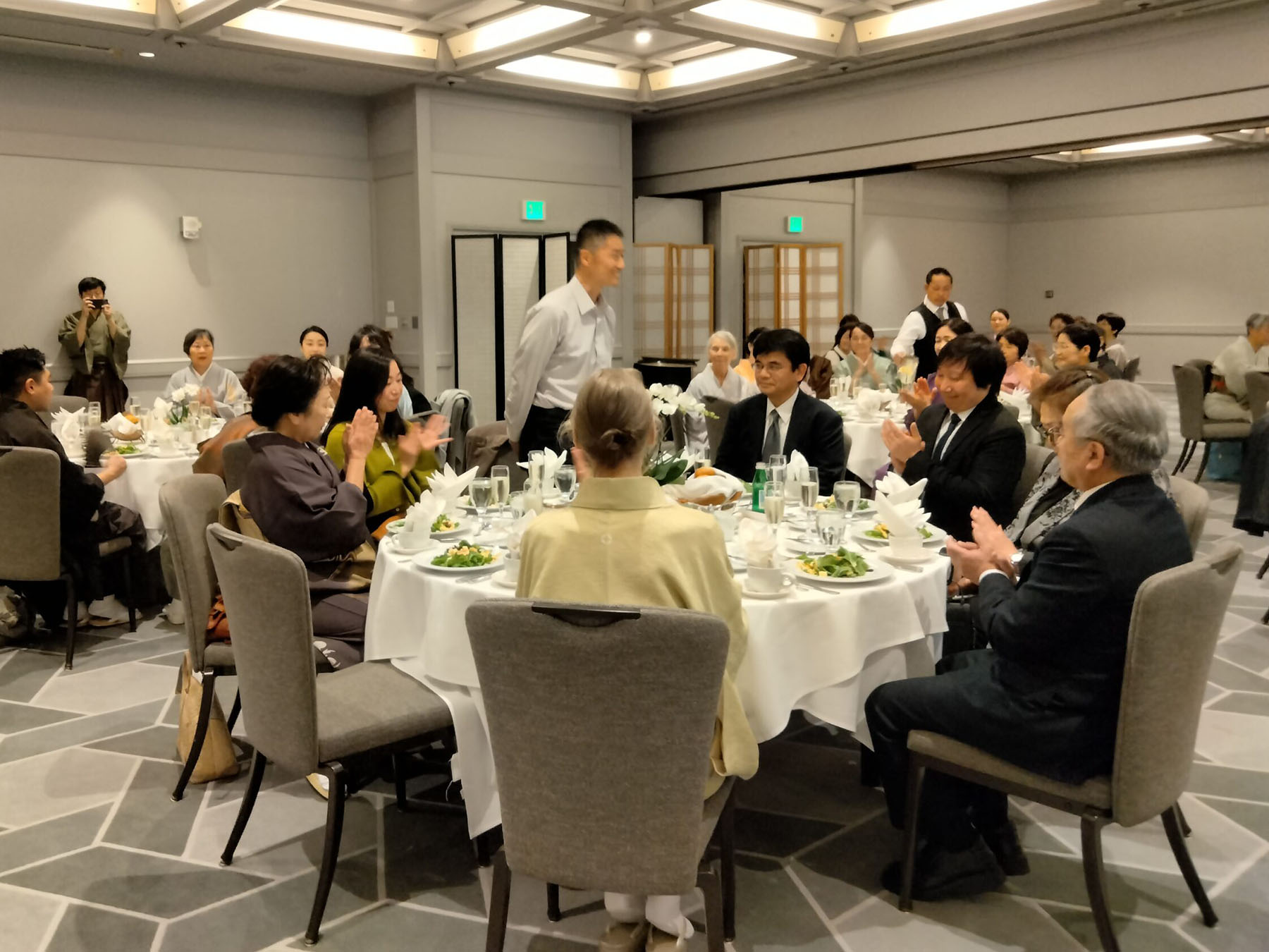 お茶席の後、1時半より新年祝賀昼食会がホテルカブキ桜ルームにて執り行われました。日よりも良く、新春の慶びと和やかさの中で、再会を喜び合いました。領事館、北加日米会会長、森川日米ウィ―クリー来賓、バートレット宗榮裏千家サンフランシスコ出張所所長らの来賓のスピーチの後、萩原宗仁幹事長より本日の感謝とお礼の挨拶がありました。司会はティスコニア宗橋でした。